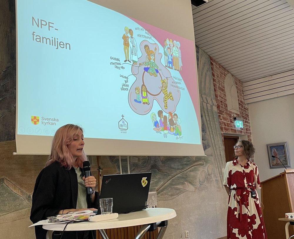 En av dagens verkstäder var ”En kyrka för alla – hur fungerar det? Kyrkans möte med NPF-familjer”, ledd av Sara Karlsson Löfgren och Helena Berggren, pedagoger i Svenska kyrkan Malmö och själva NPF-föräldrar. De utgick från projektet ”Kyrkan möter NPF-familjer” som startade hösten 2023 i Malmö pastorat och som syftar till att stärka kyrkans bemötande av familjer i behov av särskilt stöd.